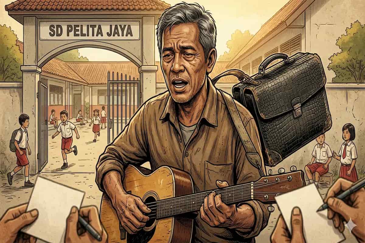 MEDIASULUT.ID – Gambar di atas bercerita banyak. Seorang pria paruh baya dengan gitar di tangan, membelakangi gerbang sekolah.