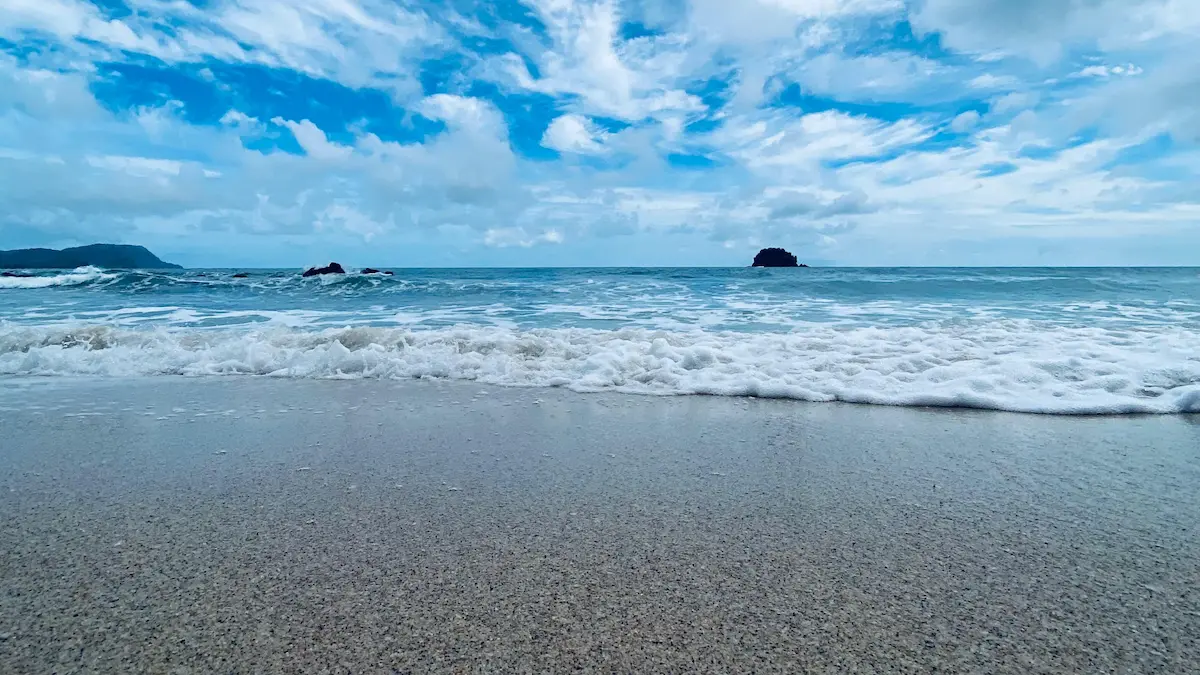 ombak menyapu pasir putih dengan pulau kecil di kejauhan