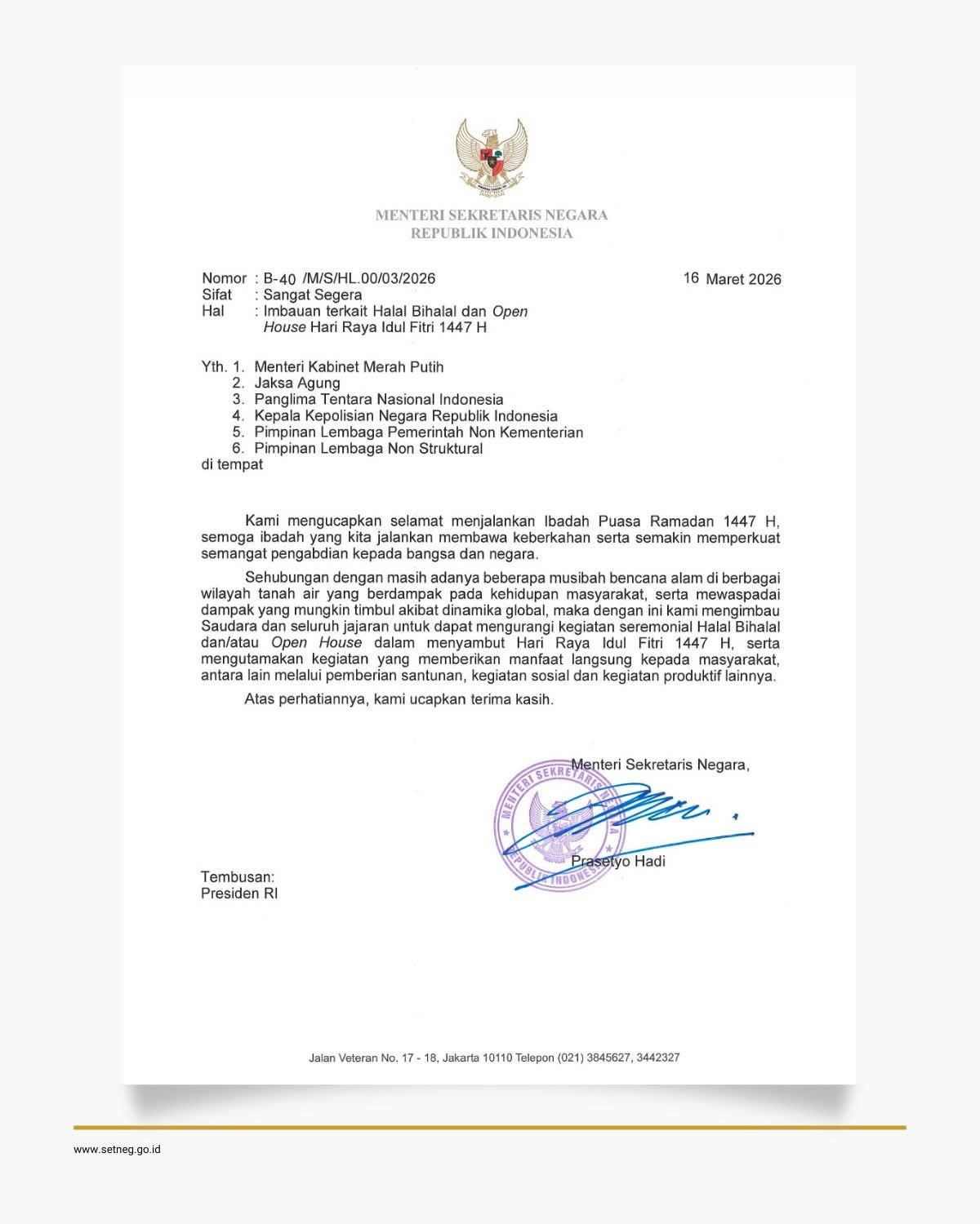 Menteri Sekretaris Negara Prasetyo Hadi menyampaikan langsung arahan tersebut di Kompleks Kementerian Pertahanan, Jakarta, Selasa (17 Maret 2026). Ia menegaskan pemerintah telah menyiapkan surat edaran sebagai tindak lanjut arahan Presiden.