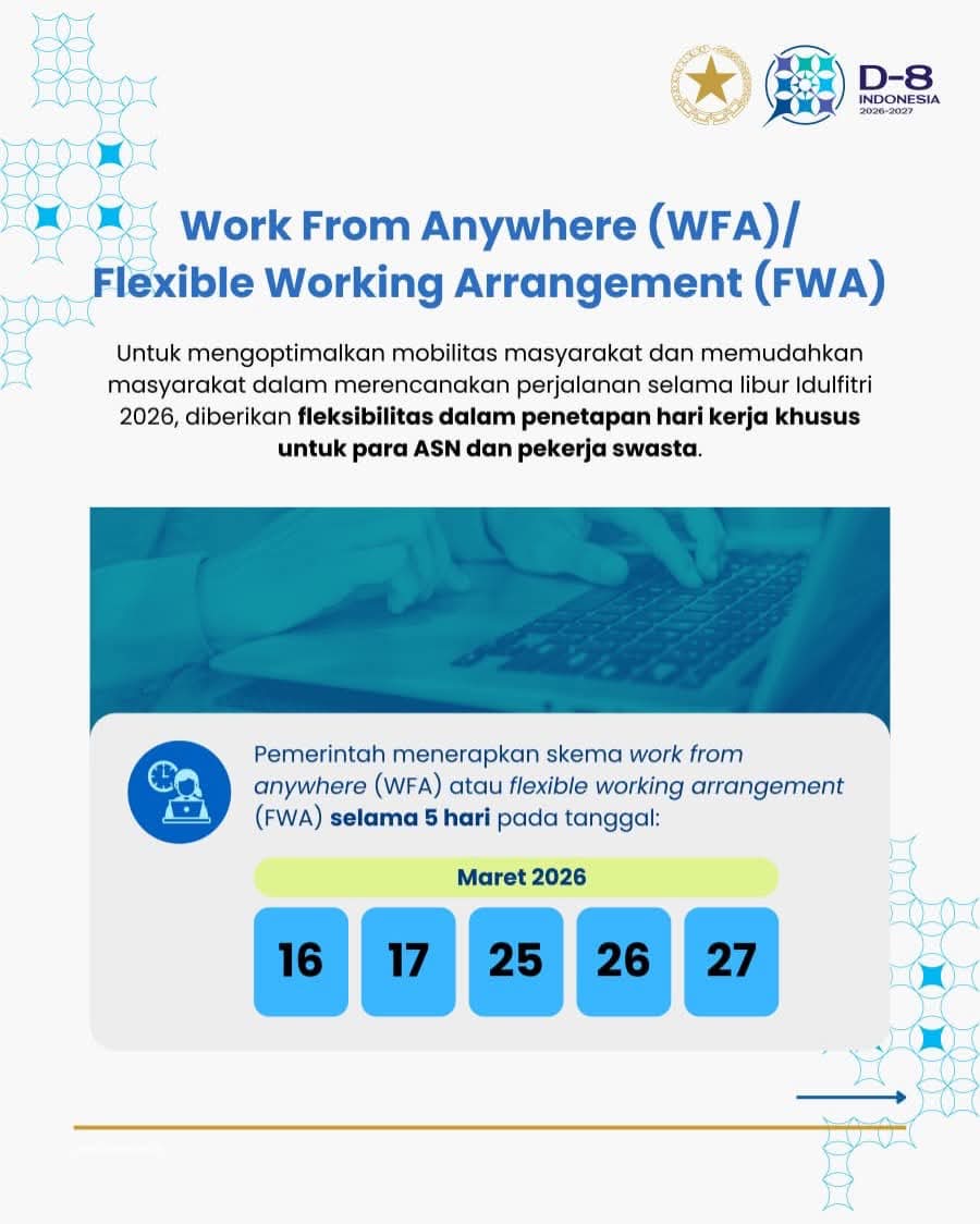 Kedua, pemerintah menerapkan kebijakan Flexible Working Arrangement (FWA) bagi Aparatur Sipil Negara. Melalui skema ini, ASN dapat bekerja fleksibel pada 16, 17, 25, 26, dan 27 Maret 2026 guna mengurai kepadatan arus mudik.